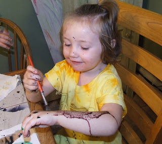 Ellie brought home a painting activity and then she went off to play so Annie and Lizzie took over. They love painting with anything and on anything!